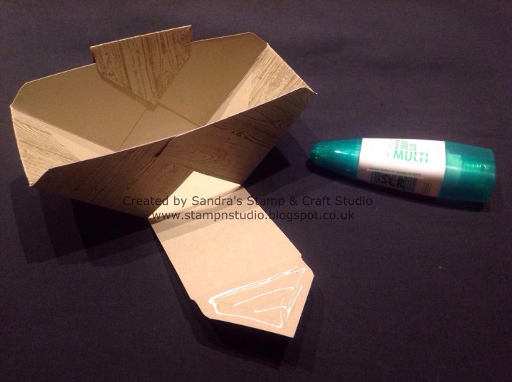 Bring the side panels in and attach in place, making sure the top is level. Apply Tombow Adhesive #110755 to the end triangles and glue inside the basket.