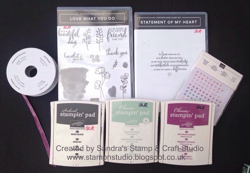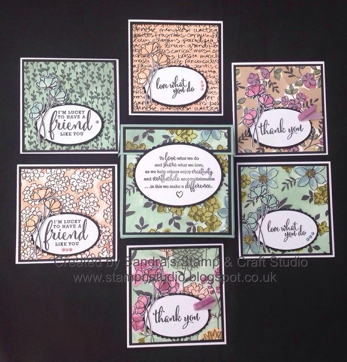 My set of six cards showcase just 6 of the 12 wonderful Share What You love Designer Series Papers #146926. The sentiments and ‘fussy-cut’ flowers are from the Love What You Do stamp set #148042 and have Share What You Love Artisan Pearls #146927 and 1/4″ Velvet Rich Razzleberry Ribbon #147016 adding accents.