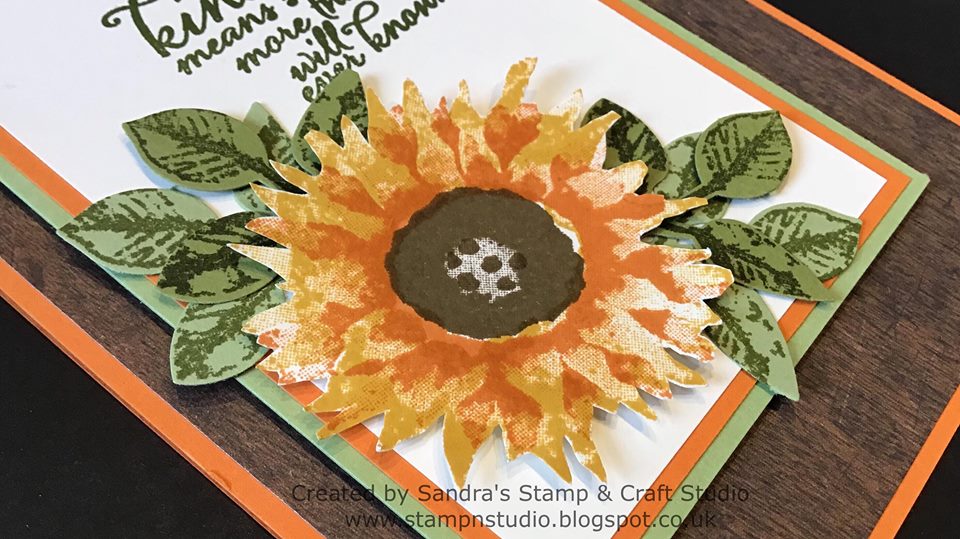 The Sunflowers were stamped in Crushed Curry, Pumpkin Pie and Soft Suede inks, then ‘fussy cut’ with our Paper Snips #103579.