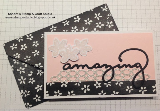 This design has a Pink Pirouette card layer and has been decorated using the Petals & More Thinlits Dies #145655. The ‘Amazing’ Die is from Celebrate You Thinlits Dies #146840, FREE from Sale-A-Bration with a £90 purchase. I was excited to see free dies in the choice of Sale-A-Bration products as I’ve never know Stampin’ Up! to offer Dies in this selection before.