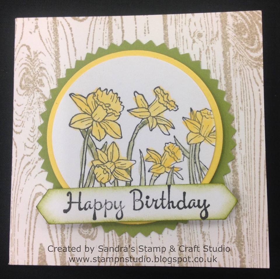 Thinking of what to share with you on todays hop theme, started me thinking of the bunches of daffodils being sold in the shops and those showing their cheery faces after the recent heavy snow. I’ve chosen to share with you a another Daffodil card, this time using the smaller cluster of daffodils from You’re Inspiring stamp set #145805 (W) #145808 (C) on a set of mini notecards/tags, in a cute little crate. I like to think of this stamp as the Tete-A-Tete variety as they are the small ones.