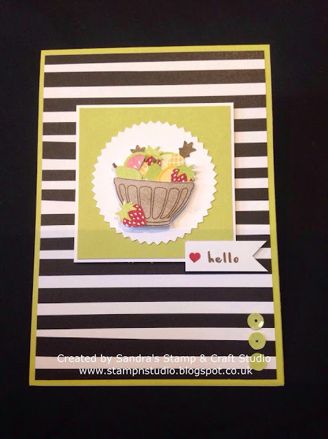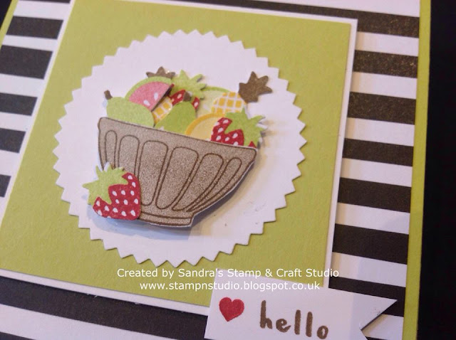I was given the Tutti Frutti Suite, featured on pages 28 & 29 to demonstrate with. This Suite contains the Fruit Basket stamp set #145833, coordinating with the four Itty Bitty Fruit Punch pack #145657 which, bought together as a Bundle, will save you 10% using code #145977.