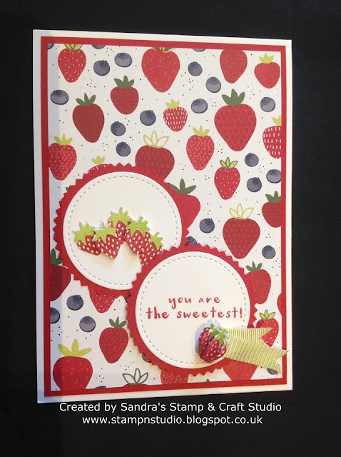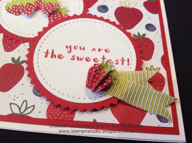 I particularly like this last one, not only because I grew up on a small farm with an abundance of strawberries and other soft summer fruits, but because each punched image was lovingly scored in half and stuck together to make a 3D strawberry ! The Lemon & Lime Twist Mini Striped Ribbon adds a finishing touch once again.