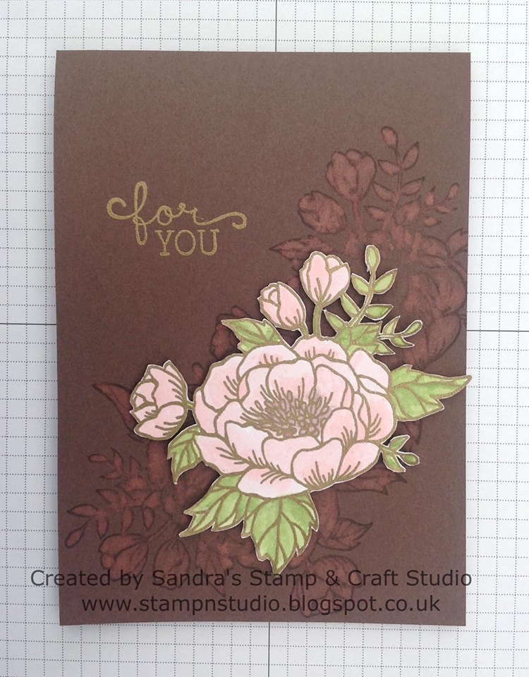 Taking inspiration from our catalogue, I chose colours for the ‘men’ in our lives, stamping the floral images as a watermark in the same Chocolate Chip as the base card. The image was stamped again on a scrap of card in Versamark ink pad #102283 with Gold Embossing powder #109129, heating with Heat Tool #129054. After colouring Aqua Painter coordinating inks, the image was ‘fussy cut’ by hand.
