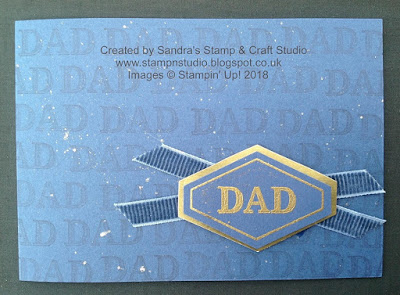 The ‘DAD’ sentiment from Truly Tailored stamp set, was stamped in Versamark ink pad #102283 and sprinkled with Gold Stampin’ Emboss Powder #109129 and heat set. This was punched with the Truly Tailored punch, mounted on Stampin’ Dimensionals #104430 onto mounted onto Gold Foil sheets #132622, cutting free-hand, leaving a slight border. Attach a couple of pieces of Night of Navy Corduroy Ribbon #145597, adding the sentiment on top.