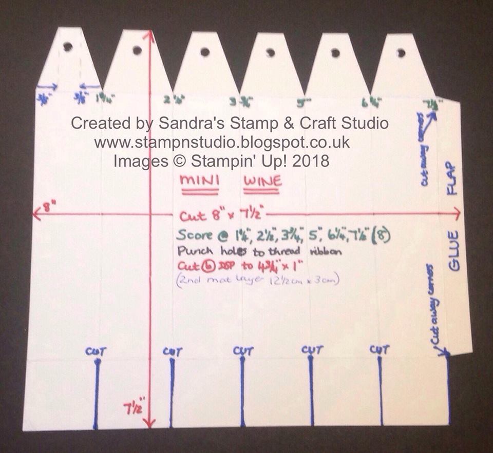 6. Place a ruler 3/8″ down from the top, marking a pencil dot in the centre where hole will be punched for ribbon. Punch holes as indicated.