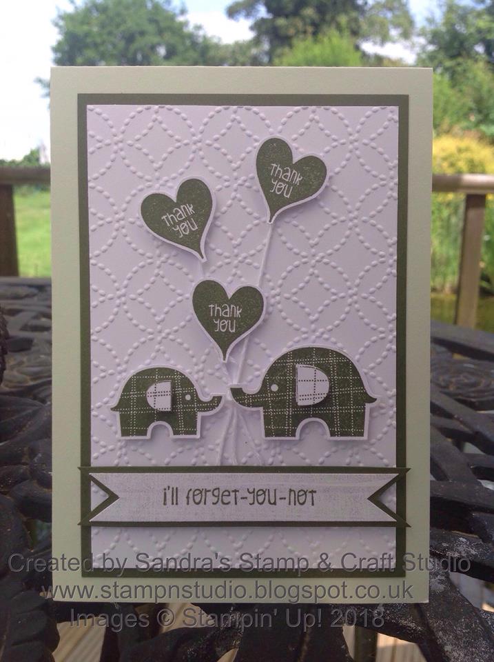 The hearts and elephants have been stamped with Mossy Meadow ink. I love that there is a coordinating punch for the elephants, then the hearts were ‘fussy-cut’ by hand and raised onto Stampin’ Dimensionals #104430 and Mini Stampin’ Dimensionals #144108. I attached strings of Whisper White Solid Bakers Twine #124262 to make them look like balloons.