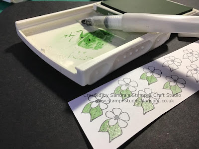 The flowers were stamped onto scraps of Whisper White and coloured in using ink pads in each of the colours. This time I used an empty Wink of Stella Glitter Brush #141897 with a drop of water, shook well to wash remaining pigment on the inner walls of the barrel and picked up the ink colour to paint with. This left a lovely sparkly finish. To incorporate all colours in the challenge on each card, the flower colours varied accordingly. Images were then ‘fussy-cut’ by hand.