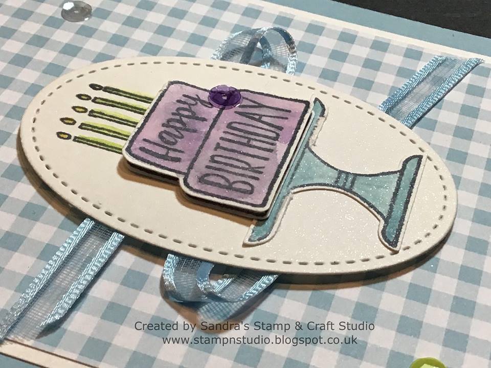 The candles were stamped at the top of the oval and together with the cake and stand, coloured in using corresponding inks. Because the colours I needed were not available in watercolour pencils, I tapped the ink pad onto the corner of a tile, picking up colour with a Blender pen #102845.