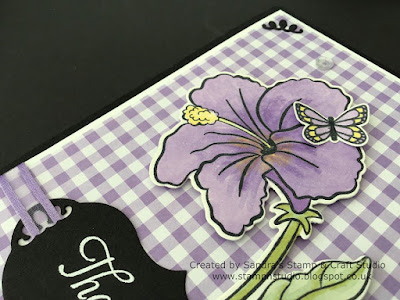 My first card used the Highland Heather from Gingham Gala Designer Series Paper #148554 on Whisper White layer and Basic Black base card. The pretty slots created by the sentiment die, made an idea mechanism to thread ribbon through and wrap round to neatly fasten on the reverse of the card. The Floral image and leaf were mounted on 3D Stampin’ Dimensionals #104430.