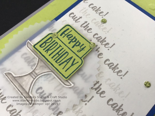 For the cake itself, I stamped image in Blueberry Bushell ink pad #147138 and punched both cake pieces with the Cake Builder punch.